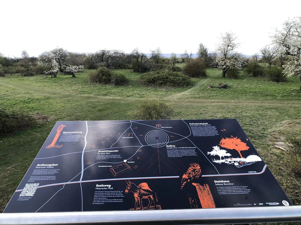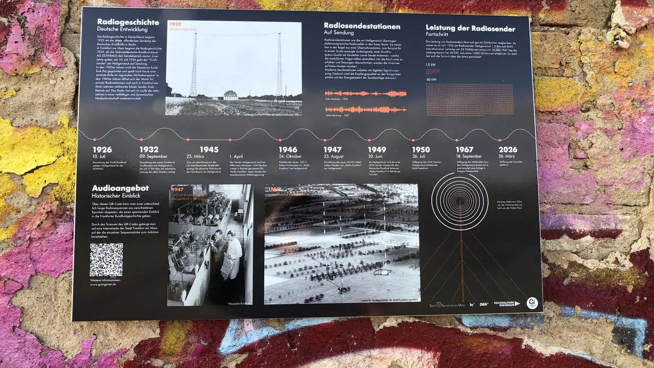 Zwei Info-Tafeln, am Gebäude und auf der Plattform, klären über die Geschichte des Radiosenders, die früheren Gebäude sowie die Besonderheit des Grüngürtel-Areals auf. Foto: MAXLOK MEDIA
