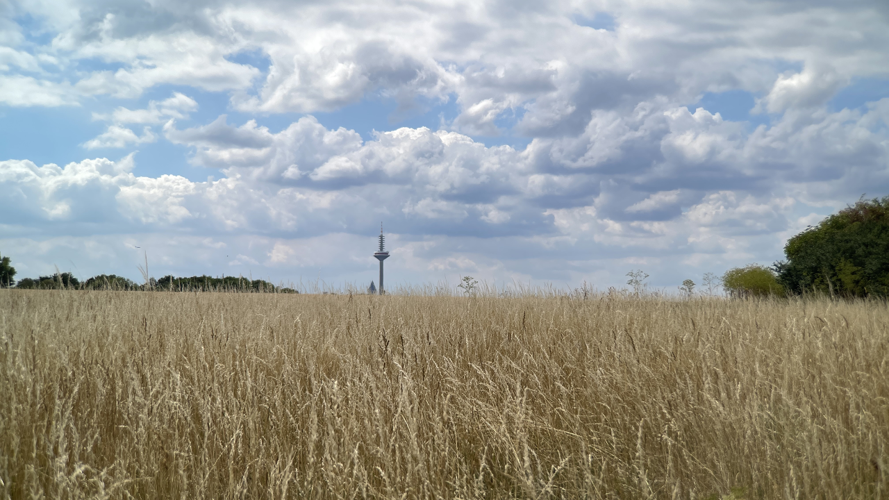 Ansicht oben: Von den Wegen des Grüngürtels im Abschnitt des Stadtteils Bonames ist der Fernsehturm als ferne Wegmarke auszumachen. Foto: MAXLOK MEDIA