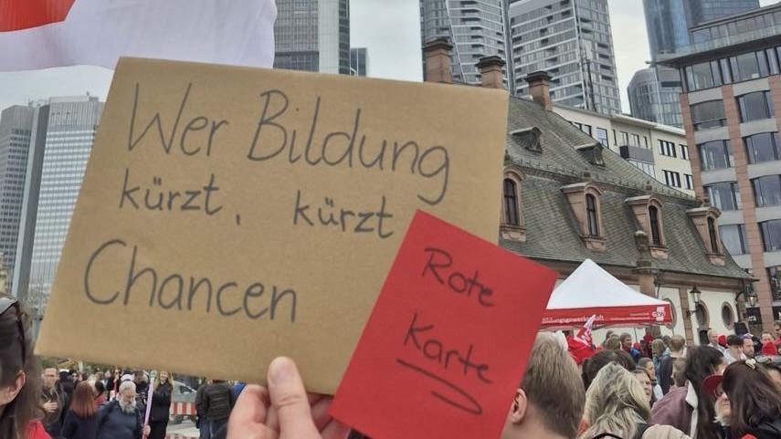 Ansicht oben: Auch die vom Land angekündigten Kürzungen im Bildungssektor wurden bei der Kundgebung am Samstag in der Frankfurter Innenstadt scharf kritisiert. Foto: MAXLOK MEDIA