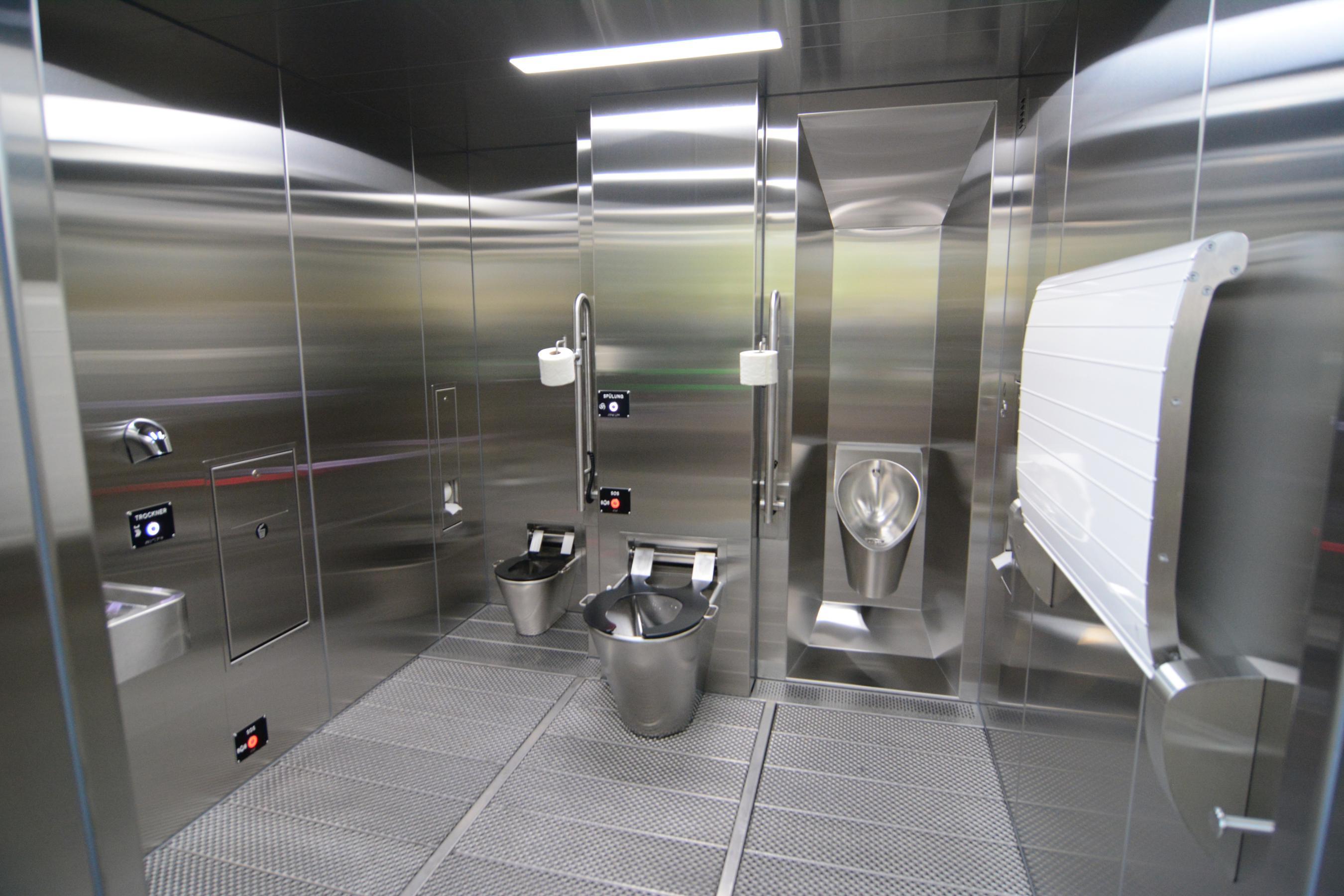 Das eingebaute Familienmodul verfügt über eine barrierefreie Toilette, einen Waschtisch, einen Wickeltisch und ein Urinal. Mit einer zusätzlichen Toilette mit niedrigem Kindersitz wurden auch die Bedürfnisse der kleinsten Spielplatzbesucher berücksichtigt. Der Zugang zur Toilette ist barrierefrei und besitzt eine rollstuhlgerechte Breite.