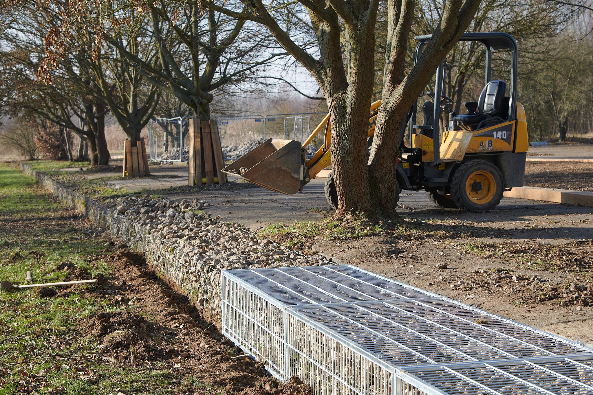 Ansicht oben: Das Gabionenband, das auf dem Alten Flugplatz saniert und erneuert wird. Foto: Stadt Frankfurt / Stefan Cop